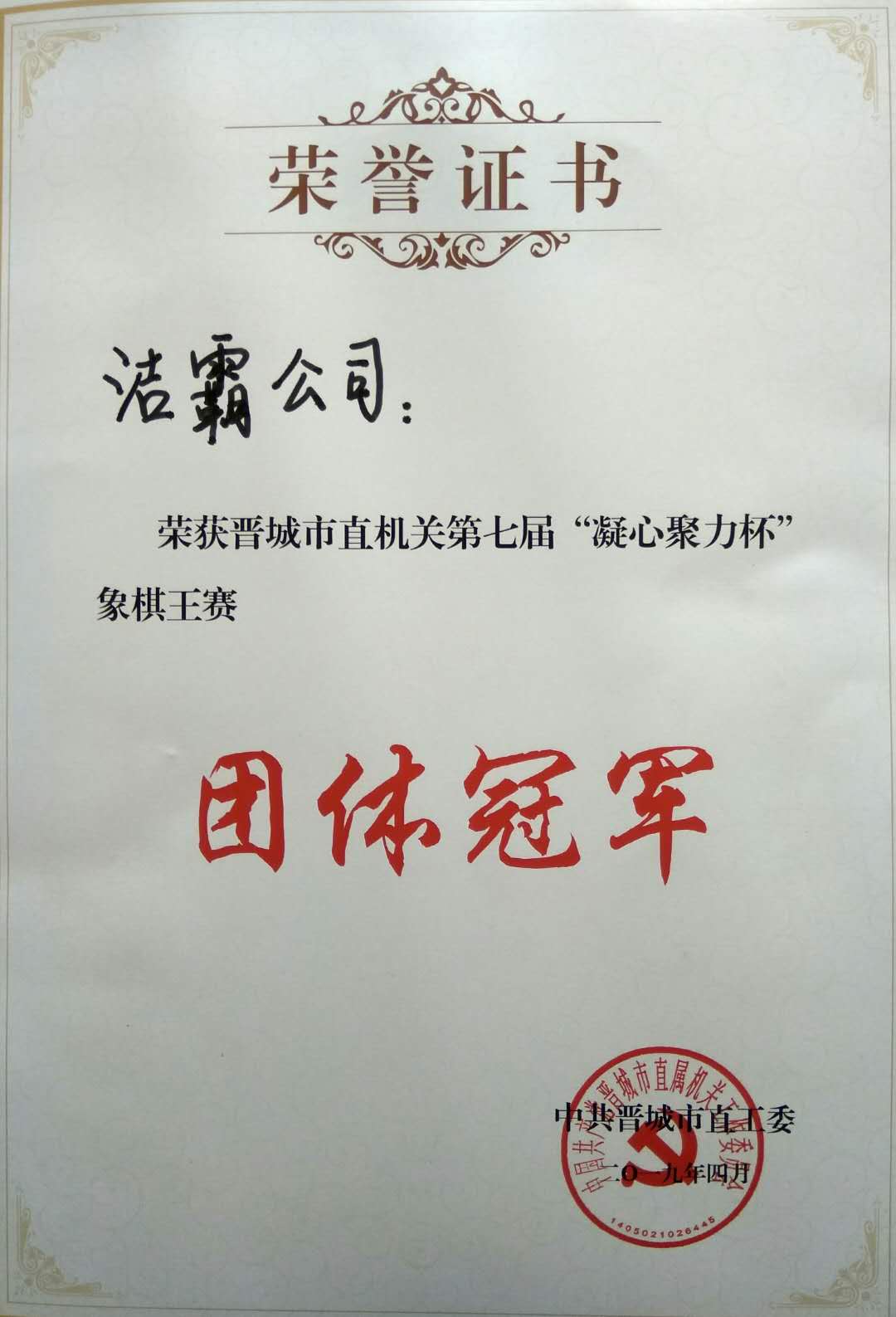 | 我公司榮獲晉城市直機(jī)關(guān)第七屆“凝心聚力杯”象棋王賽團(tuán)體冠軍 |