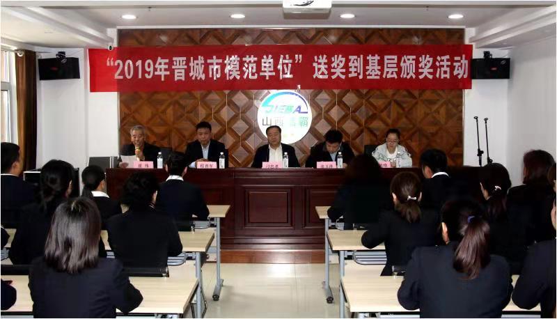 10月11日上午,晉城市總工會副調(diào)研員刁忠孝、商貿(mào)工會主席張玉濤、商貿(mào)工會干事李艷艷一行蒞臨公司舉行“2019年晉城市模范單位”送獎到基層頒獎活動,向公司榮獲“晉城市模范單位”表示祝賀,公司黨支部書記、總經(jīng)理程晉軍、公司副總經(jīng)理史志霞、公司原黨支部書記李山虎以及公司部分員工代表參加頒獎活動。公司工會主席崔偉主持了頒獎儀式。