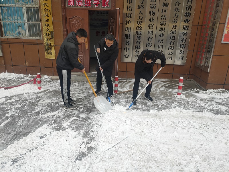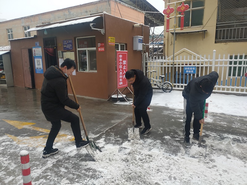 為了景西花園出行居民和公司員工的人身安全,5日早上,公司晨會結(jié)束后,由公司辦公室牽頭,潔霸員工們帶著鐵鍬、掃帚、撬棍等工具,在小區(qū)門口開展清除冰雪活動。