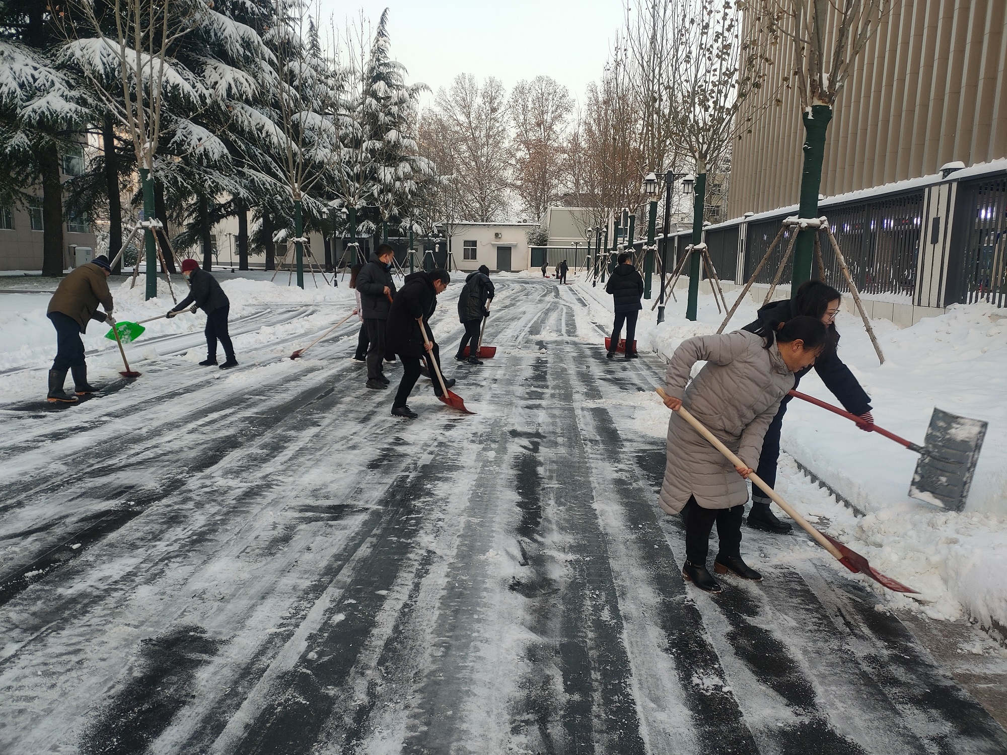 持續(xù)降雪,連續(xù)作業(yè)。16日晚,我市再次迎來降雪天氣。17日一大早,公司全體黨員和入黨積極分子又第一時間投入到市政府除冰雪的戰(zhàn)斗中,大家團結(jié)協(xié)作,不畏嚴寒,確保了上午九點以前市政府院內(nèi)人員、車輛通行順暢。