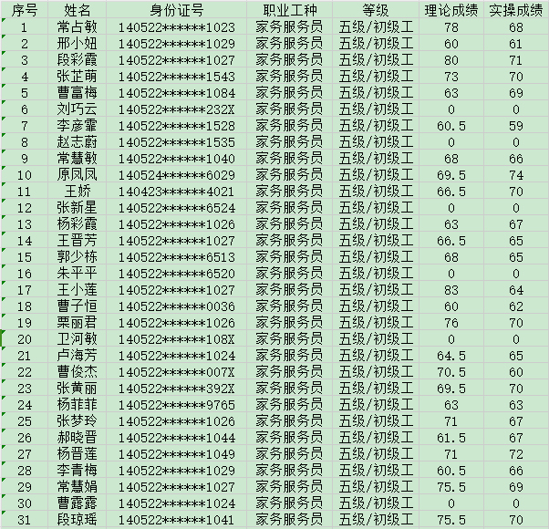 2024年8月31日第33批家政服務(wù)員初級認(rèn)定人員成績公示