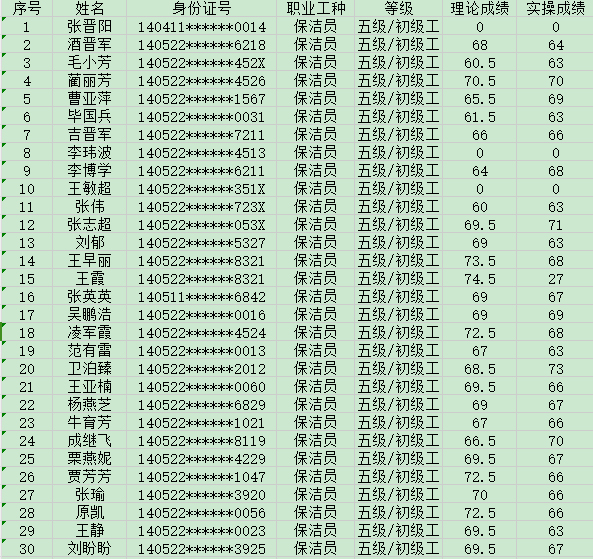 晉城市潔霸清潔服務(wù)股份有限公司職業(yè)技能等級(jí)認(rèn)定中心現(xiàn)將2024年8月31日認(rèn)定人員成績公示如下: